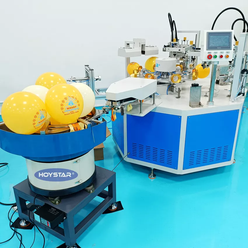HOYSTAR est un fabricant et fournisseur fiable en Chine ; Cette machine de sérigraphie de ballons HOYSTAR 2 couleurs avec chargeur automatique est conçue pour l'impression sur des ballons en latex. Équipé d'une table de travail rotative, d'un chargement automatique, d'un soufflage automatique, d'une rotation automatique, d'un séchage automatique, de fonctions de déchargement automatique. Contrôle par écran tactile PLC, interface conviviale pour un fonctionnement sûr et intuitif. La machine allie rapidité, précision et simplicité d’utilisation.