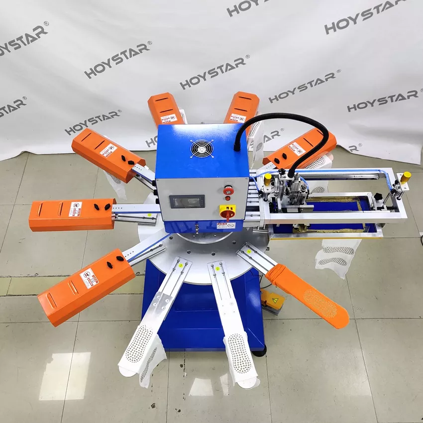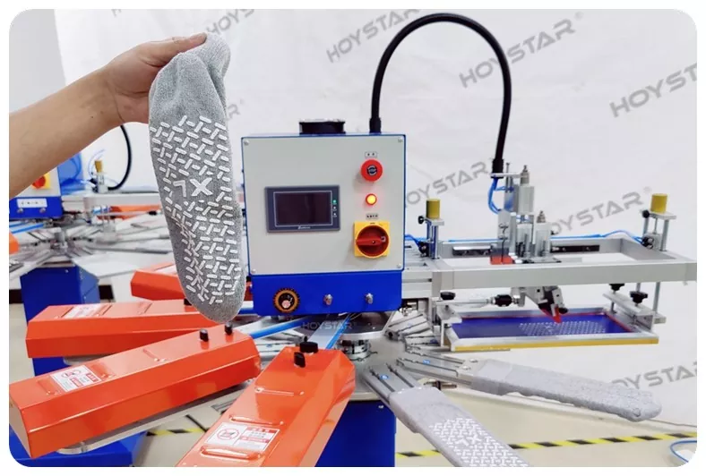 En tant que fabricant professionnel en Chine, nous souhaitons vous fournir une machine de sérigraphie HOYSTAR très rapide pour chaussettes. Nos machines adoptent un contrôle PLC et écran tactile et sont principalement utilisées pour imprimer divers types de chaussettes. La machine peut imprimer sur les semelles et les talons des chaussettes et est équipée d'un four de séchage capable de bien sécher le silicone et l'encre.